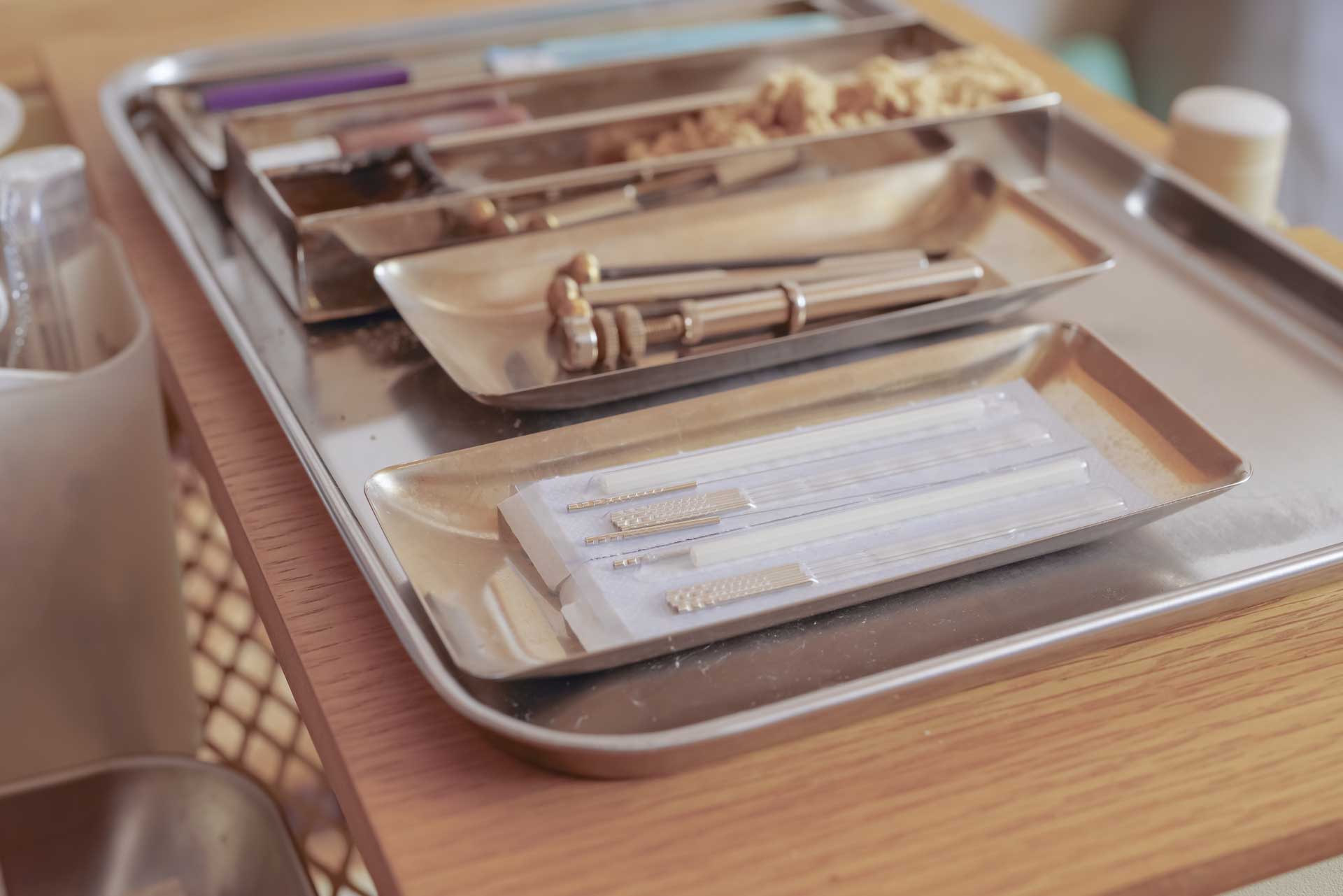 極細のステンレス製あるいは銀製の細い鍼(ハリ)などを使って、ツボや筋膜、神経などを刺激してこわばりや滞りをほどいていきます。